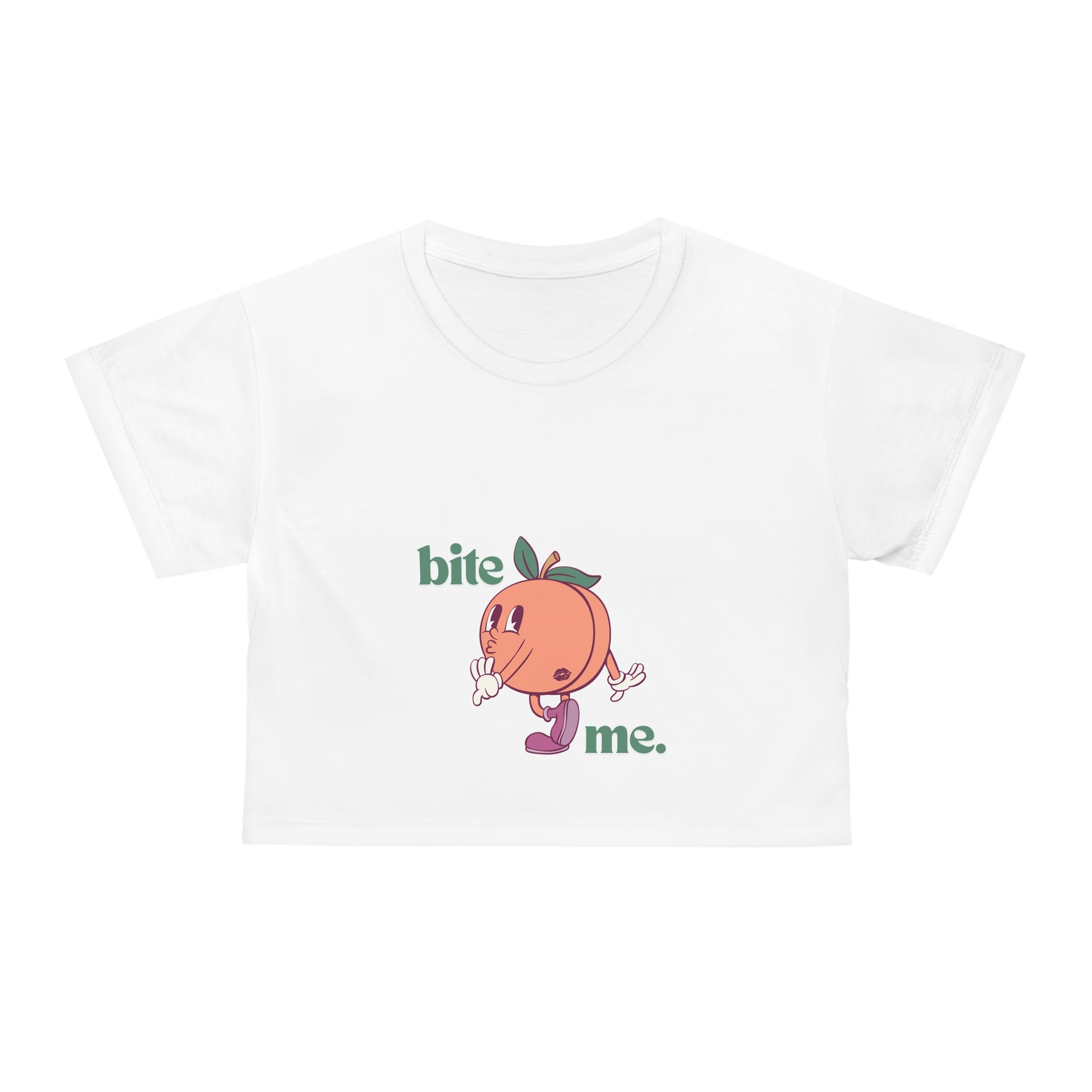Sweet on the surface, savage underneath. The Bite Me crop top features a sassy cartoon peach with just enough attitude to match your energy. Set on a soft light pink backdrop with an all-over print, this tee turns heads while keeping things cute.