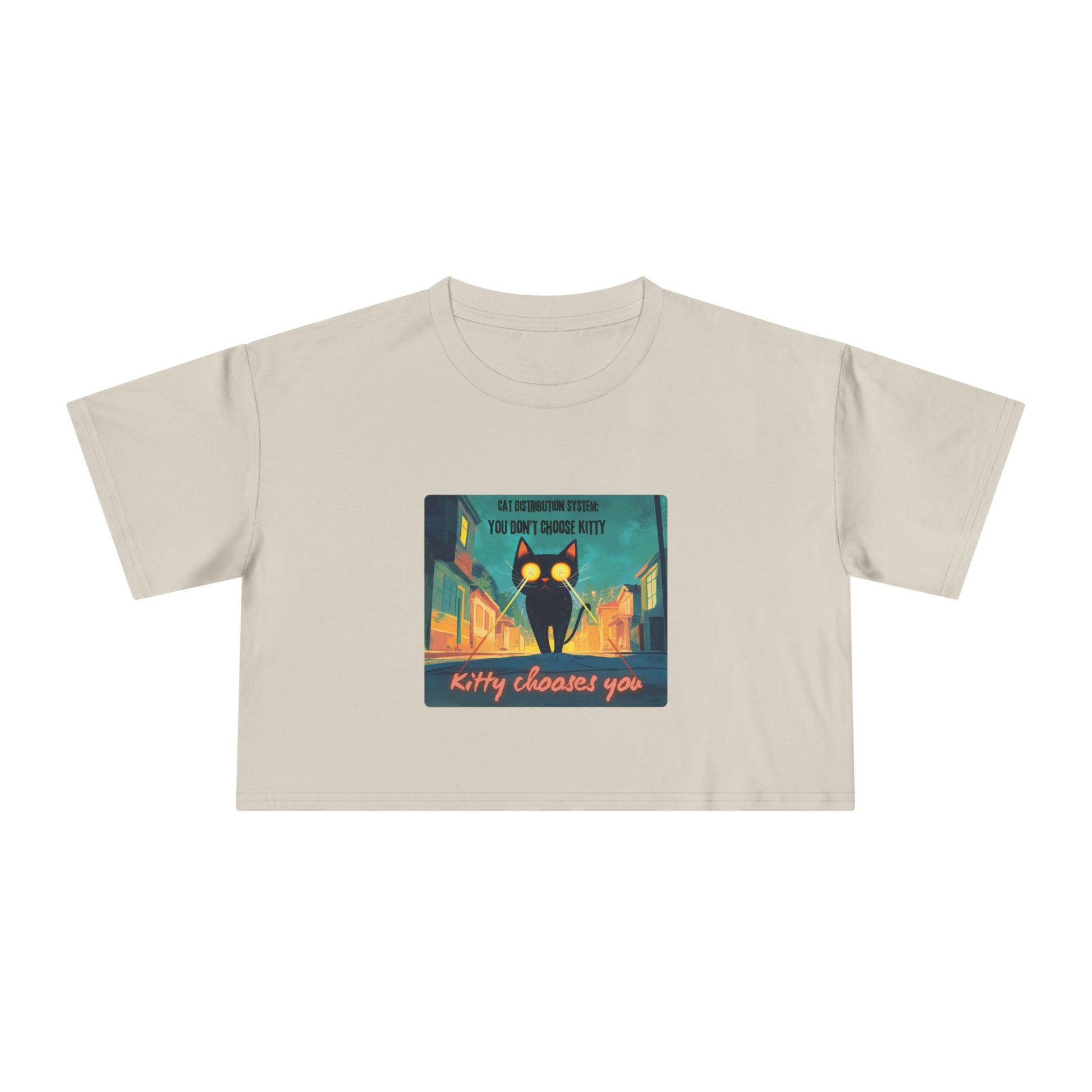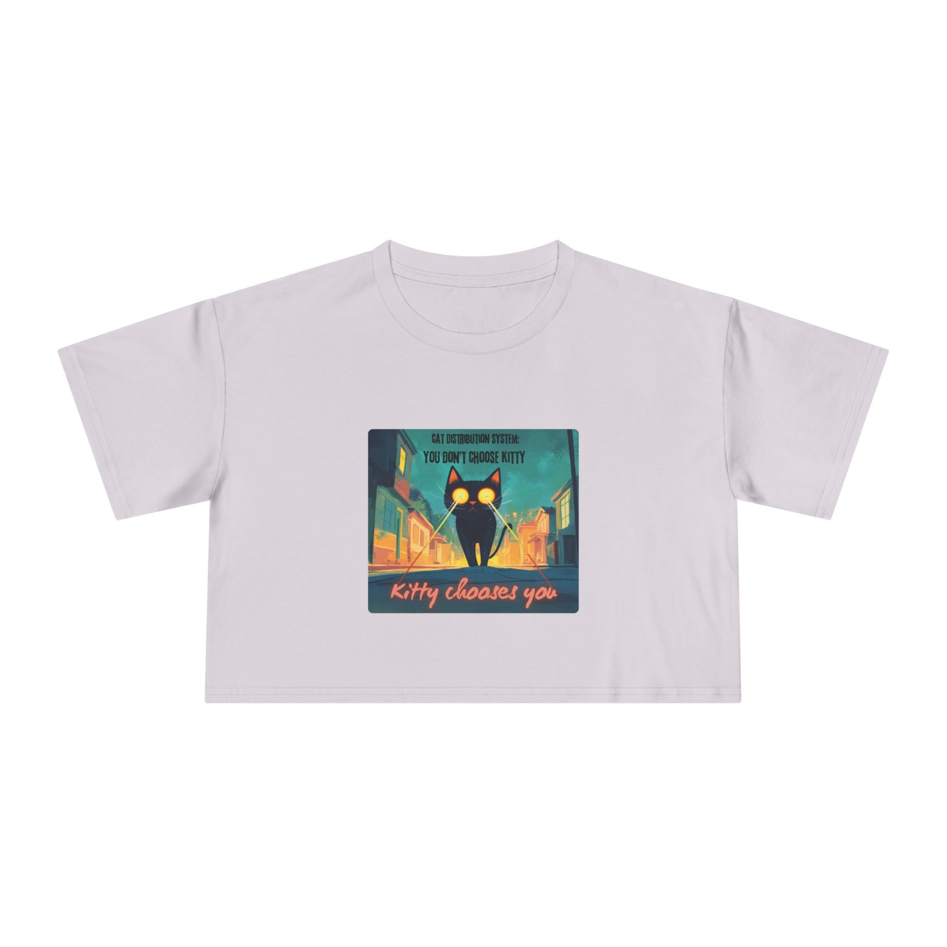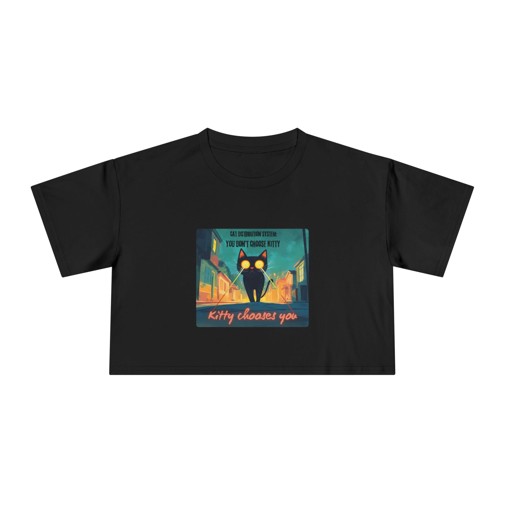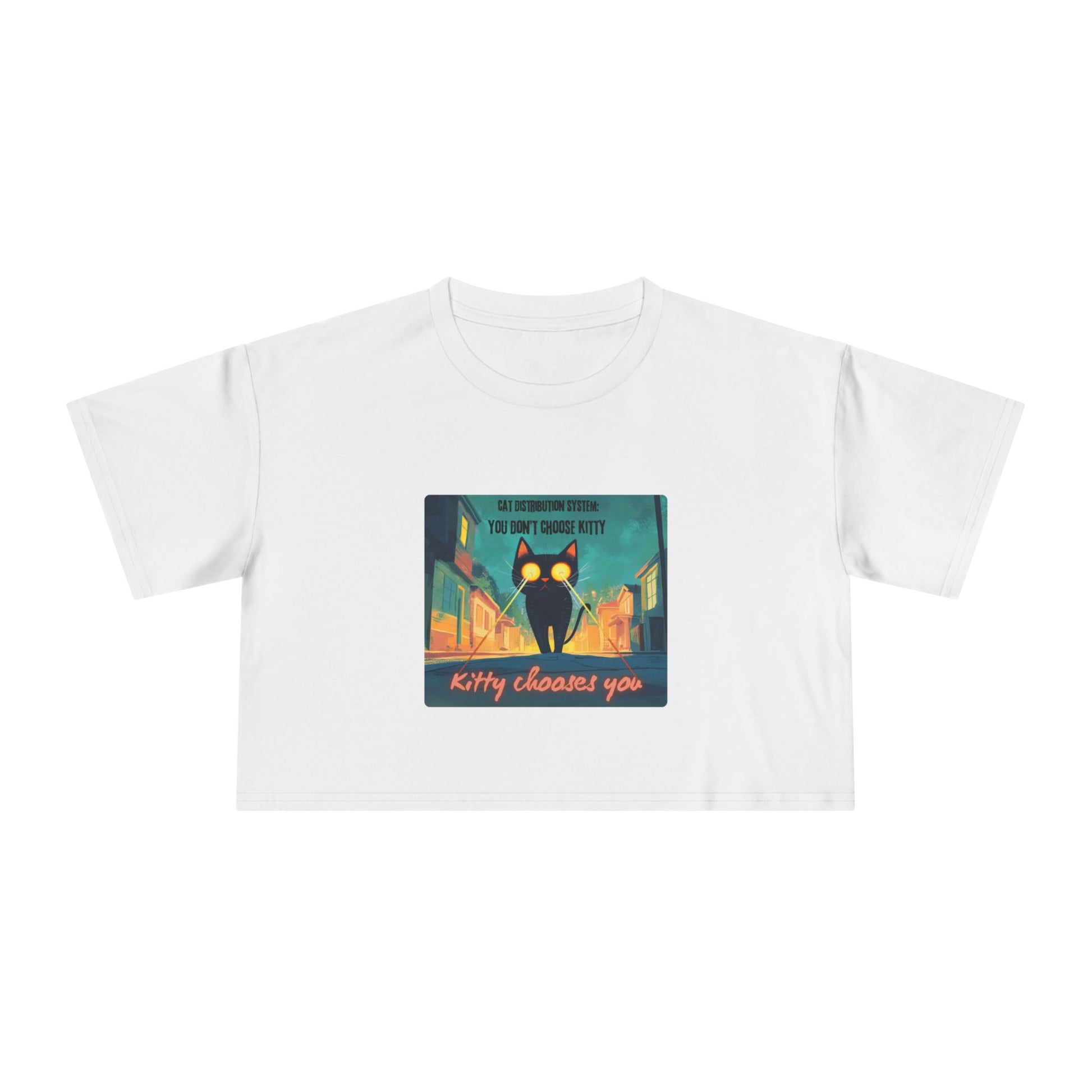 Get zapped by feline fate. This soft, relaxed crop features a cosmic street kitty mid-mission — shooting lasers from her eyes as she searches for her forever human. The Cat Distribution System premium crop top is for all the surprise cat moms zapped into service — chosen by destiny, claimed by whiskers, and absolutely owned. It’s cheeky, cute, and just a little bit chaotic… aka purrfection.