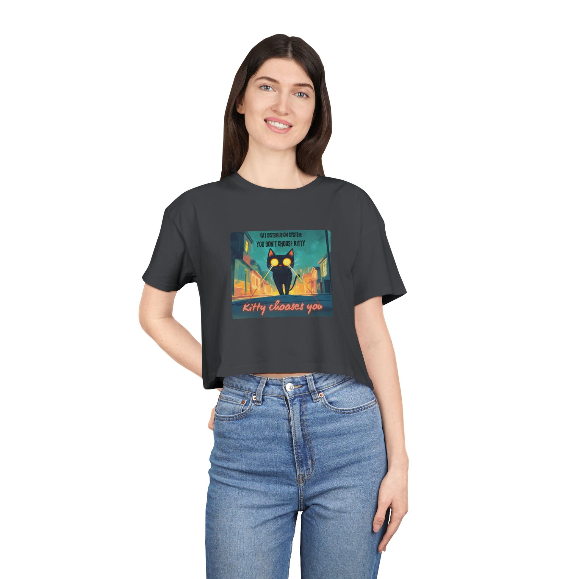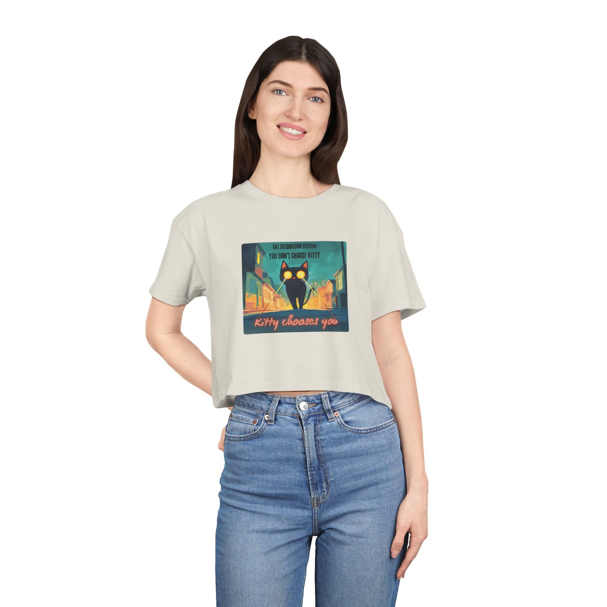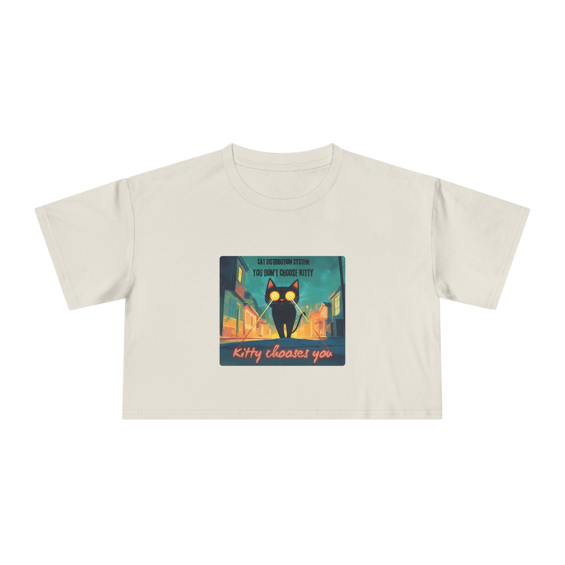 Get zapped by feline fate. This soft, relaxed crop features a cosmic street kitty mid-mission — shooting lasers from her eyes as she searches for her forever human. The Cat Distribution System premium crop top is for all the surprise cat moms zapped into service — chosen by destiny, claimed by whiskers, and absolutely owned. It’s cheeky, cute, and just a little bit chaotic… aka purrfection.
