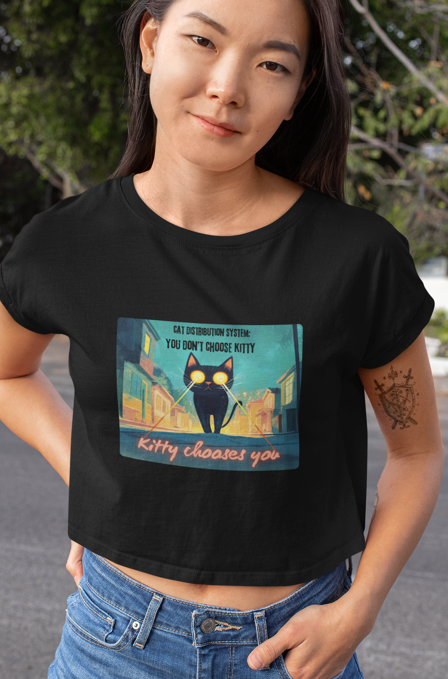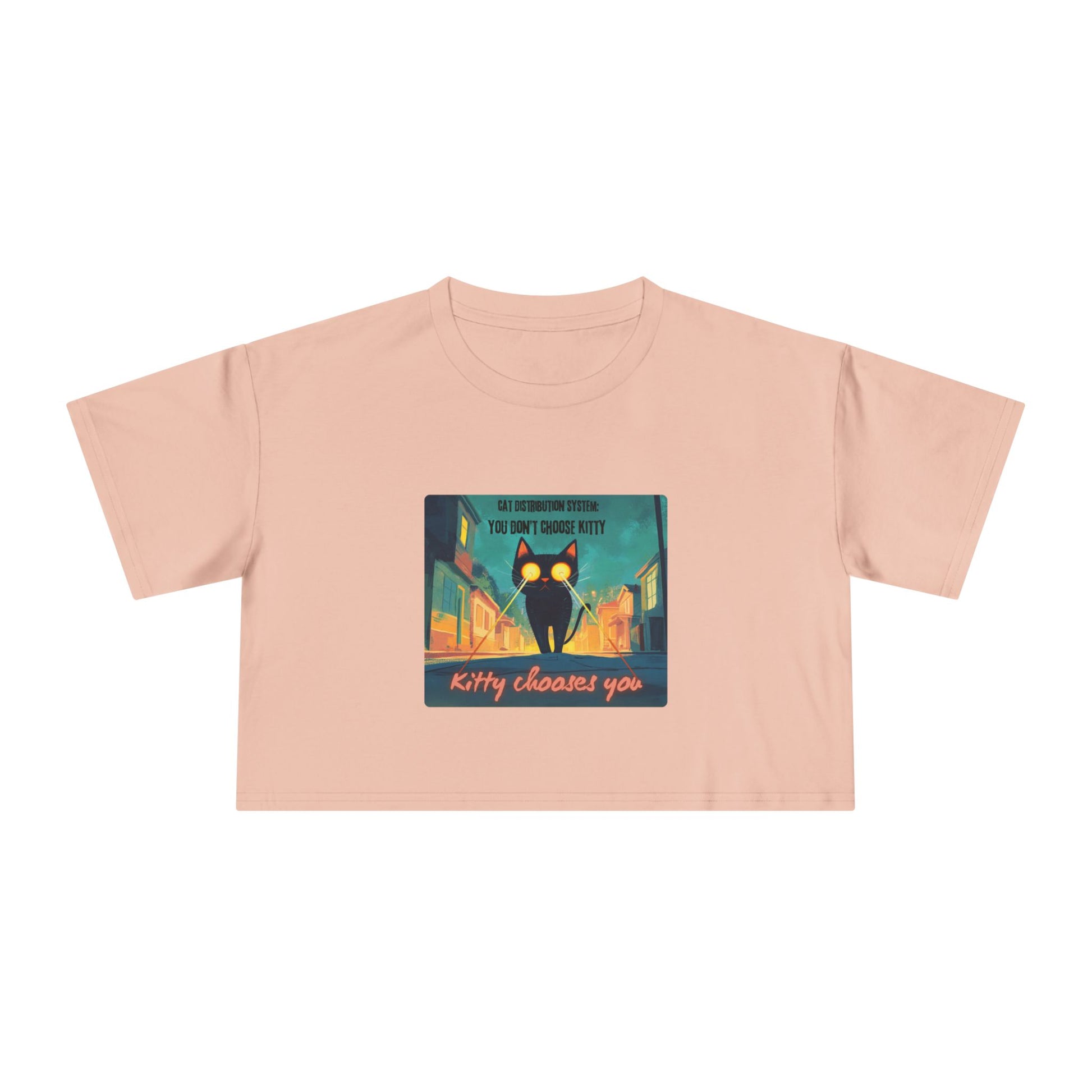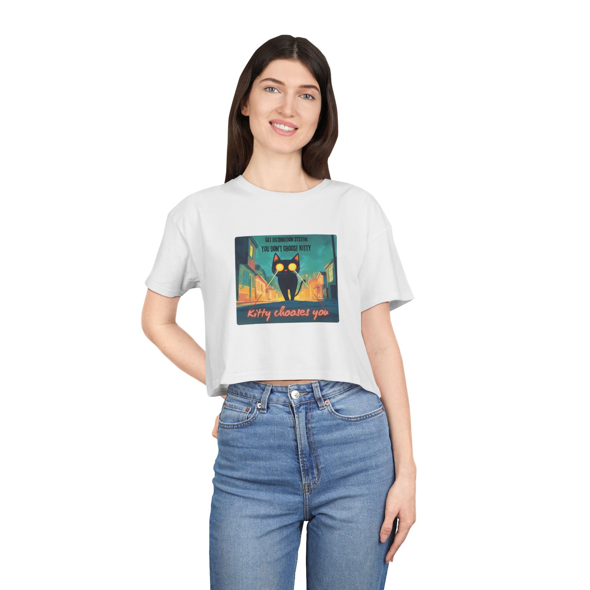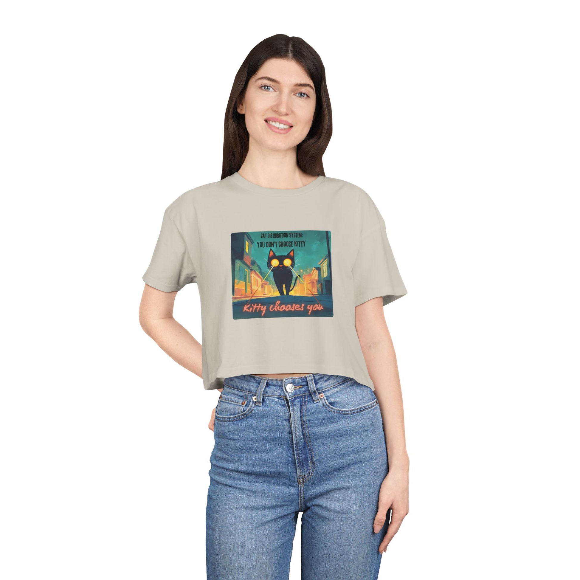 Get zapped by feline fate. This soft, relaxed crop features a cosmic street kitty mid-mission — shooting lasers from her eyes as she searches for her forever human. The Cat Distribution System premium crop top is for all the surprise cat moms zapped into service — chosen by destiny, claimed by whiskers, and absolutely owned. It’s cheeky, cute, and just a little bit chaotic… aka purrfection.