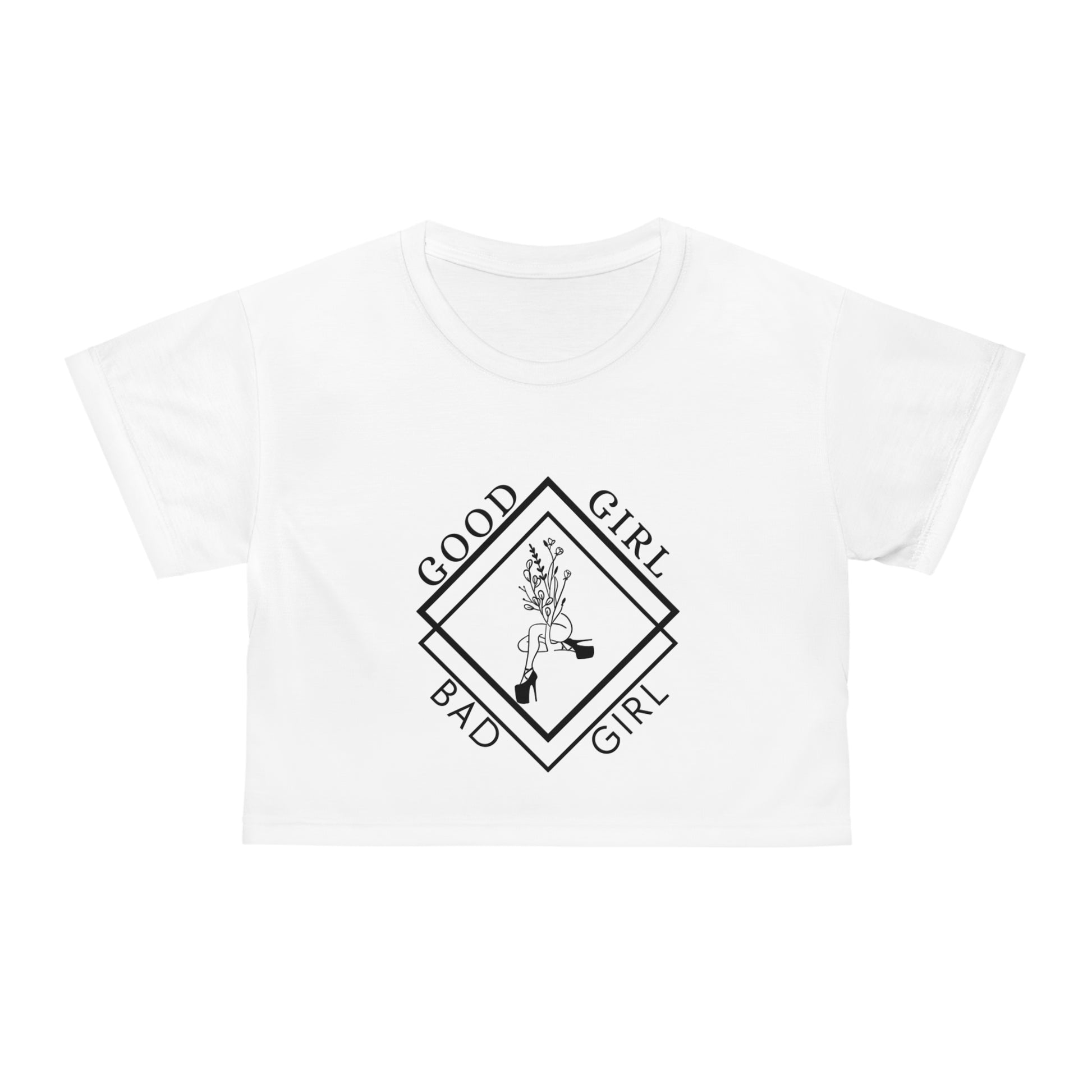Meet the top that reps the brand and the energy 💎 The Good Girl Bad Girl Logo Crop Top is bold, feminine, and a little rebellious—just like you. Featuring our signature diamond logo with the iconic flower dancer at the center, this tee is made for those who wear their duality like a crown.