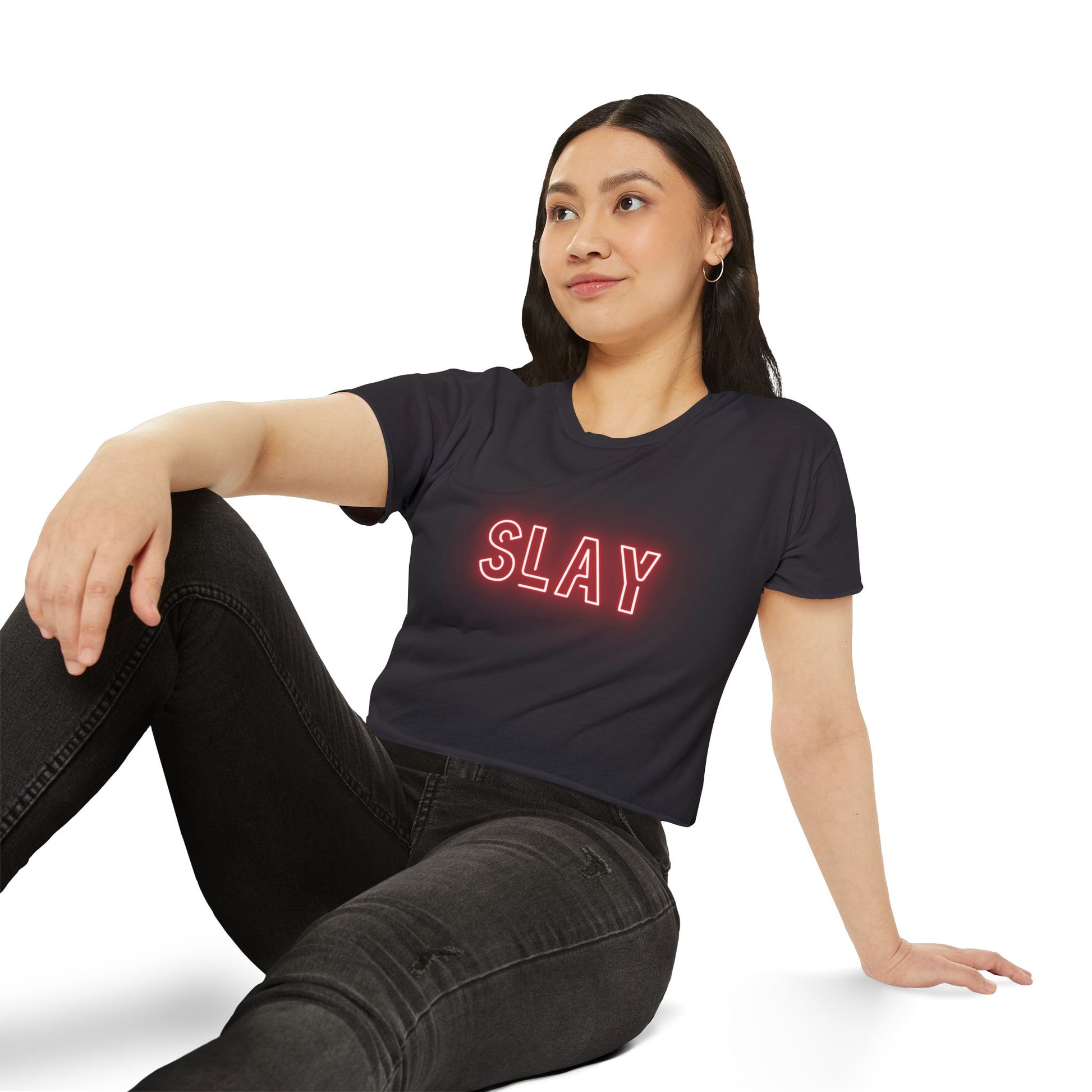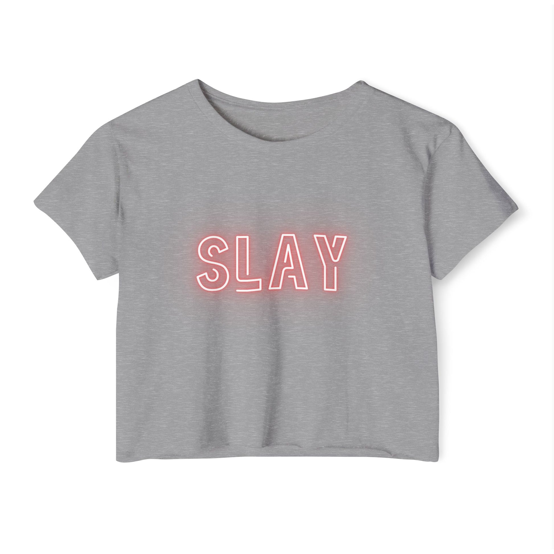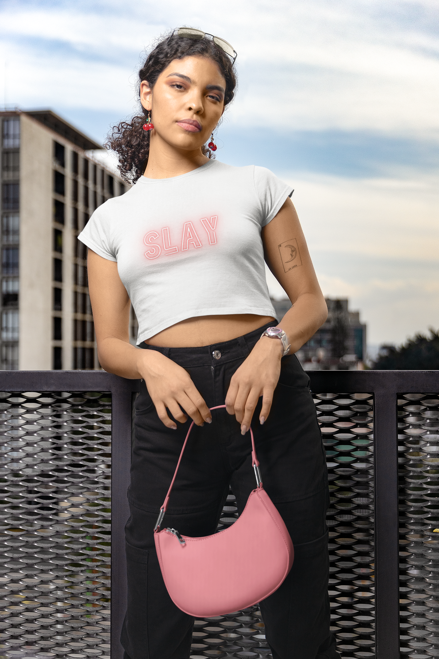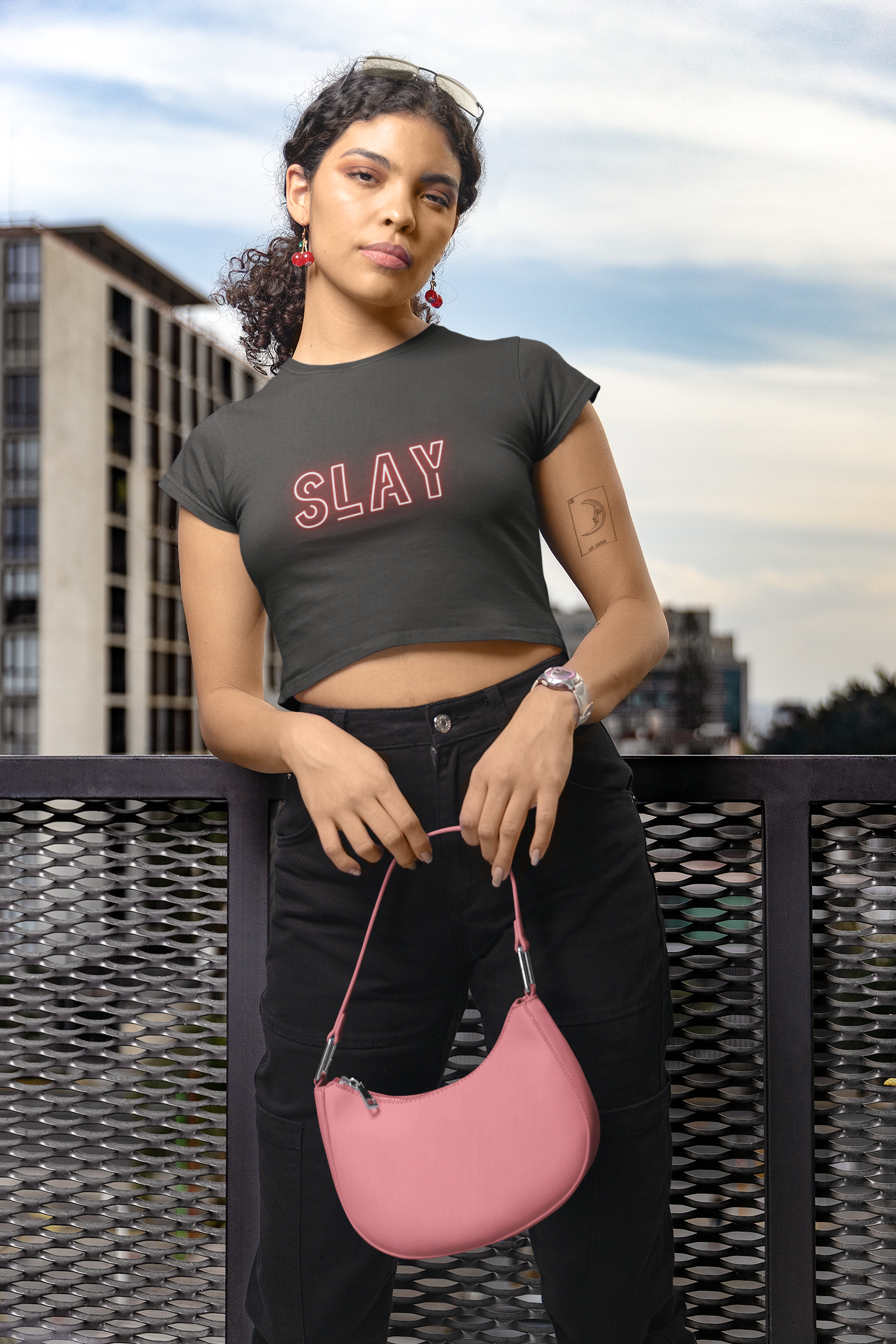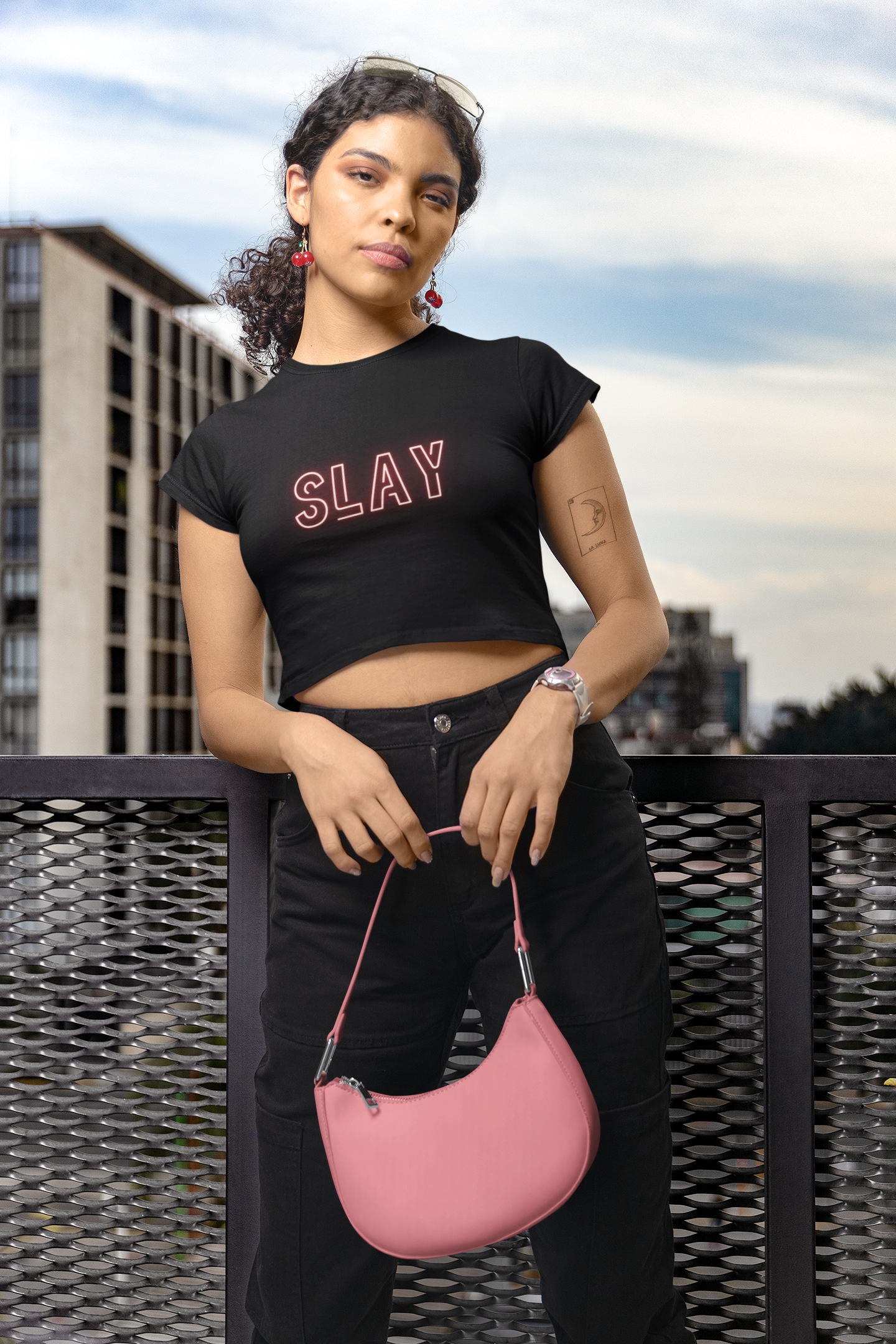 She doesn’t just walk in — she slays. This crop top makes a bold (and glowing) statement with “slay” printed in radiant pink letters that practically light up the room. Feminine, fearless, and totally fire.